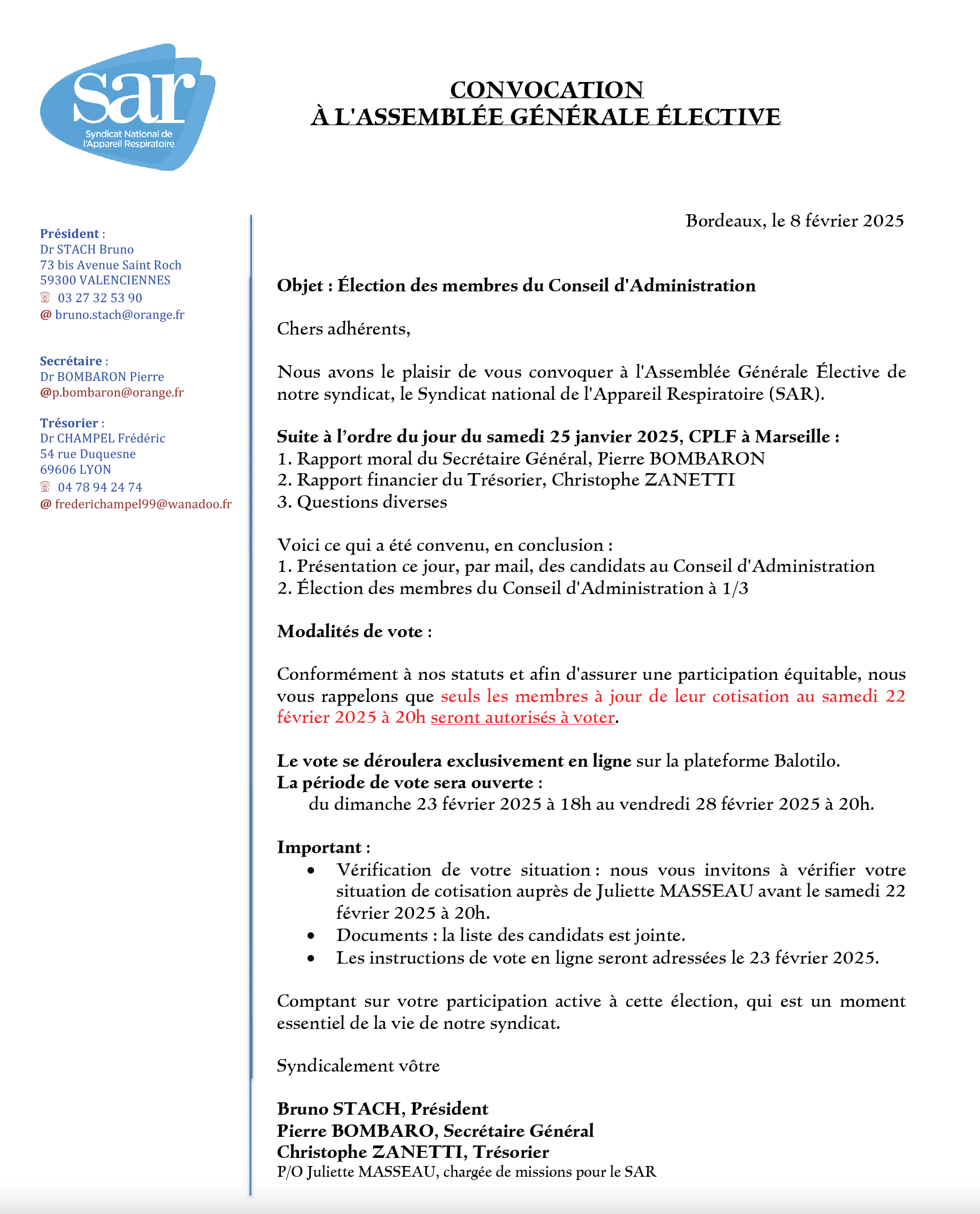 la lettre du président et invitation à la reunion lors du CPLF >>, convocation à l'AG du SAR >>, programme de l'AG >>, pouvoir >>, bulletin de vote >>